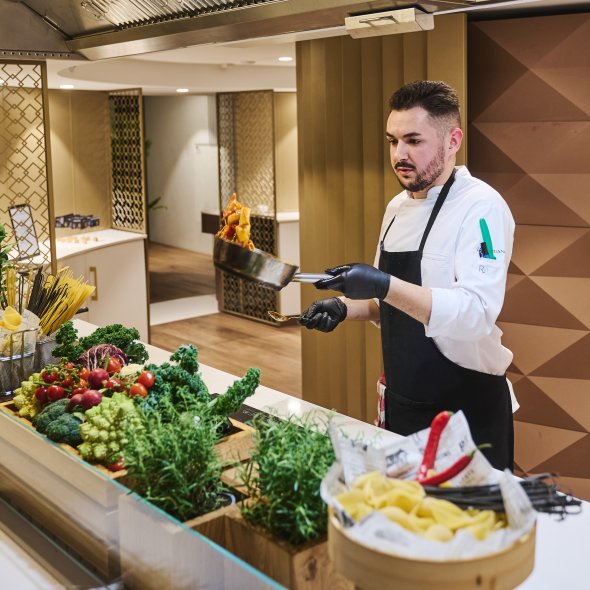 A wonderful start to the day is guaranteed by our breakfast buffet, rich in local products. It even includes vegetables from the hotel's own gardens and an abundance of vitamins, as well as homemade cold cuts and freshly baked bread straight from our new Italforni Diamond oven. We also recommend eggs prepared in various ways, cooked live right before your eyes.