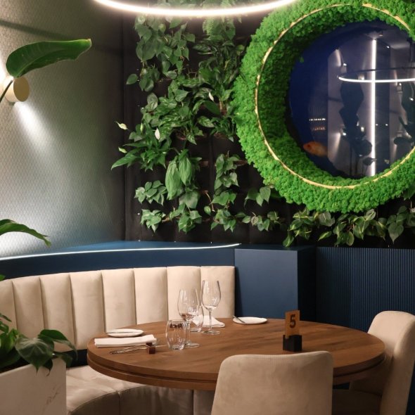 Nowe wnętrze restauracji Aruana to harmonijne połączenie natury i elegancji. Przestrzeń wypełniają subtelne odcienie zieleni, wygodne krzesła w delikatnych barwach i stylowe, drewniane stoły, które dodają wnętrzu ciepła. Miękkie oświetlenie oraz designerskie detale tworzą przyjemną, odprężającą atmosferę – idealną, by cieszyć się wyjątkowymi smakami nowego menu. Aruana zaprasza do miejsca, gdzie tradycja spotyka się z nowoczesnością, a każda wizyta staje się wyjątkowym doświadczeniem.